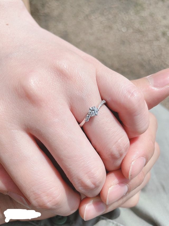デザイン、普段使いのしやすさ、ダイヤの綺麗さ、日常的につけても違和感のないデザインやダイヤの大きさ。結婚指輪の購入がいつになるのかわからなかったため、結婚まで使ってもらえるような物を意識して選びました