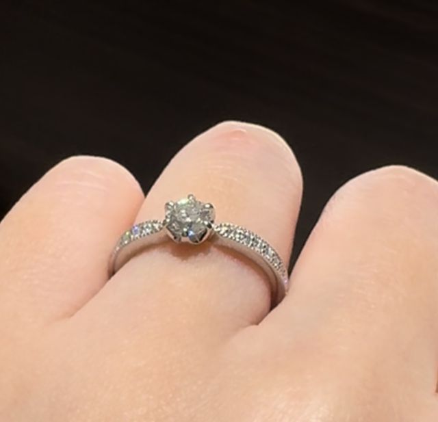 指輪のデザインはもともと決まっていたのですが、細身で且つダイヤモンドの存在感をちゃんと出せる様なデザインを希望していたので、周りにメレダイヤをたくさんあしらっているこの指輪のデザインがとても気に入りました。