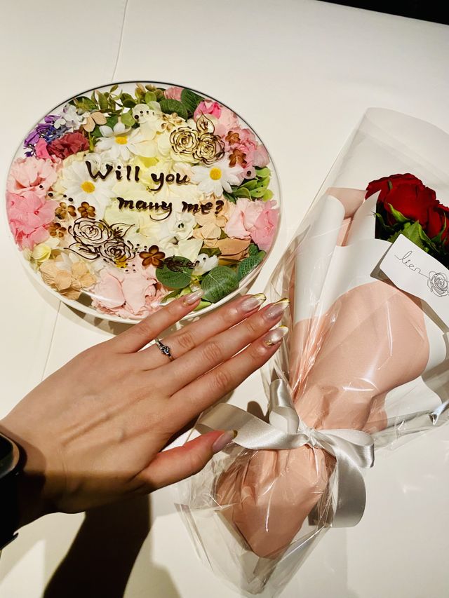 2人にしかわからないような意味が込められたデザインの指輪で、この先、指輪をみるだけでプロポーズの日、それまでの期間の思い出がひとつひとつ蘇る。ダイヤモンドの加工にこだわりがあったり、品質がとてもよく、つけていて思わず見てしまう。