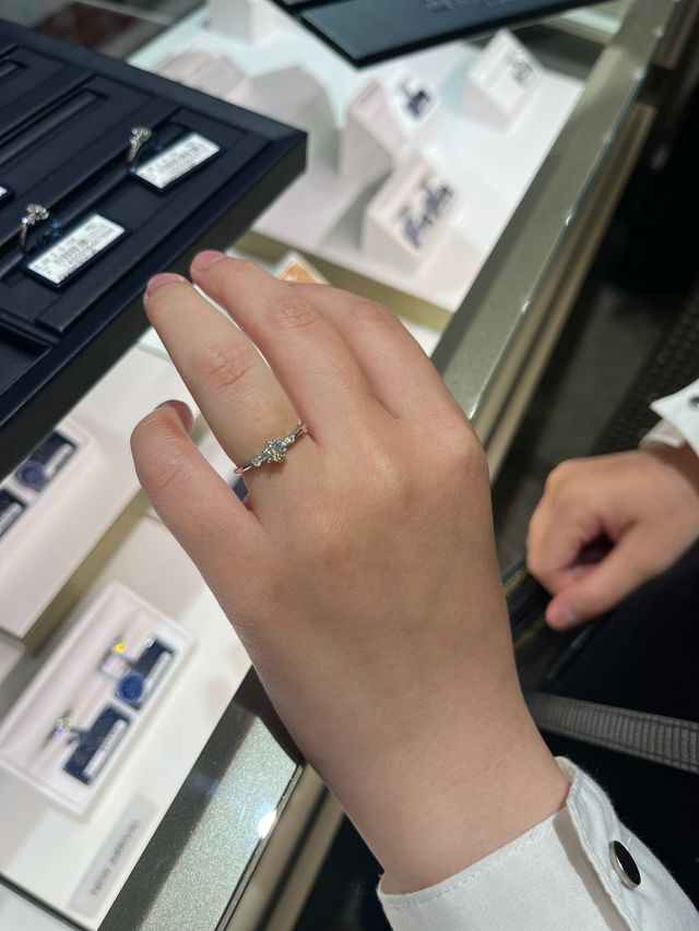 ダイアモンドの質がとにかく高いのが選べてよかった。デザインも指にあっていて、本人も気に入った形、元々目星をつけていた形にあったものが見つかってよかった。また派手すぎずシンプルすぎず多様性という点でも良いと思う。
