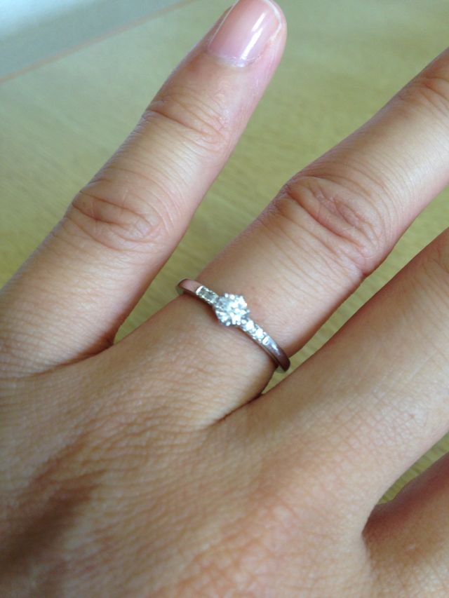 自分では選んでいないので、決め手というものはありませんが、素敵な指輪を選んでもらいました。どんなものでも嬉しいのですが、シンプルだけど、ダイヤがはっきりと目立つデザインがとても気に入りました。結婚してからも出かけるときには結婚指輪と一緒に付けています。