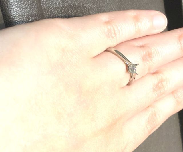 婚約指輪に関して特に具体的なイメージがあったわけではなく、店員さんと相談し試着しながらじっくりと決めていきました。基本的にどんなファッションにも合うこと、日常生活で使いやすいことなどを考えシンプルなデザインにしました。ダイヤモンドは大きめできれいです。