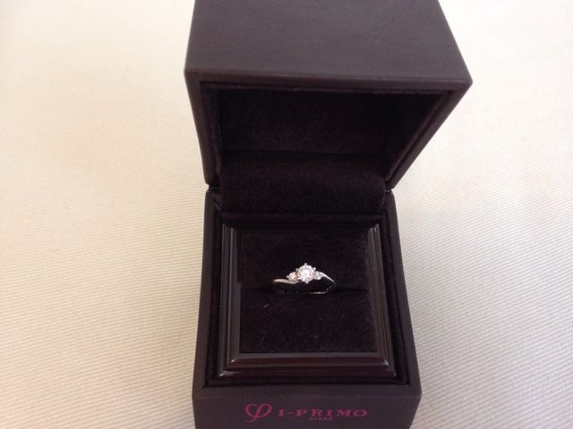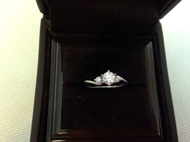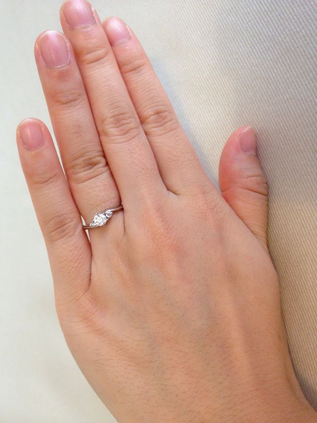私の中で婚約指輪といえば、一粒ダイヤが乗ったもの!という印象が強かったので、王道ですがこのデザインにしました。メインのダイヤの両脇には小さなダイヤがついているので、結婚までの毎日で身に付けやすいものを選びました。