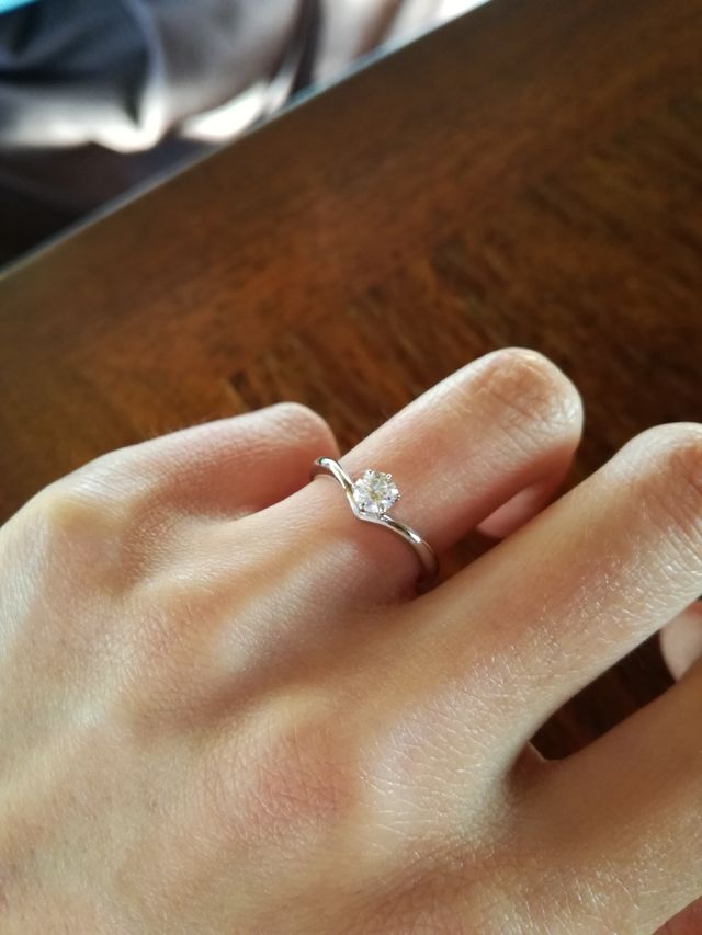 リングの形が単純な丸ではなく、真ん中に少しへこみがあることによって、指が長く細く見える効果があるそう。形がハートの様に見えて可愛かった。また、4Cにこだわっていて美しく光輝くリングに惚れてしまったから。