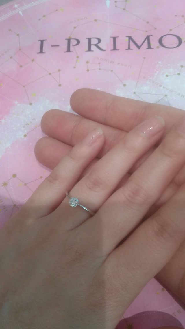 ダイヤの輝きが美しくなるハートアンドキューピッドという最高ランクのカットで彼女が一目惚れ。シンプルだけど上品なデザイン。
