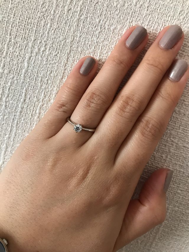 婚約指輪を彼が一人でアイプリモに行って、購入してくれました。結婚指輪を購入しても合わせやすいように、シンプルなデザインで、とても気に入っています。おばあちゃんになっても飽きのこないデザインだなと思います。