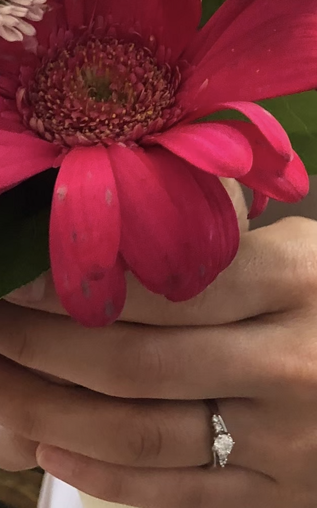 ダイヤモンドがとびだしていると服などいろいろな物に引っ掛けたり、肌を傷つけたりするのである程度低いもので、メインのダイヤモンド以外にも周辺にダイヤがあり、あまり存在感はあっても主張が強すぎないものを選びました。