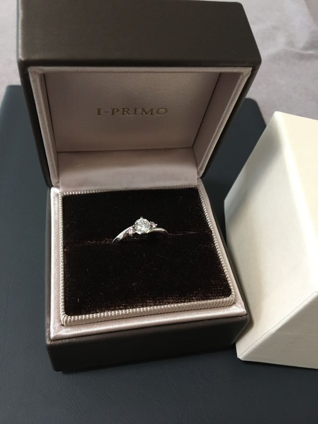 指輪のフォルムはウェーブタイプです。中央にメインのダイヤ、その左右にはピンクダイヤがあります。担当の方から聞いた話では、3つのダイヤは過去、現在、未来
