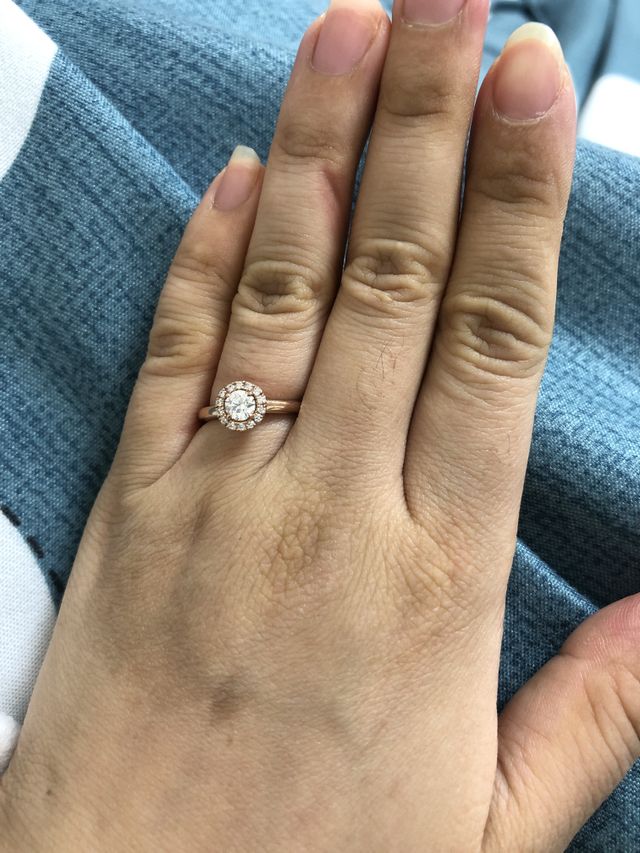 シンプルな中に、凛とした印象で、取り付けた宝石も、他のブランドであまり取り扱っていないグレードの石を選んでいただけました。他店のブランドさんも同じように石を見せてくれましたが、1番光り輝いていました。
