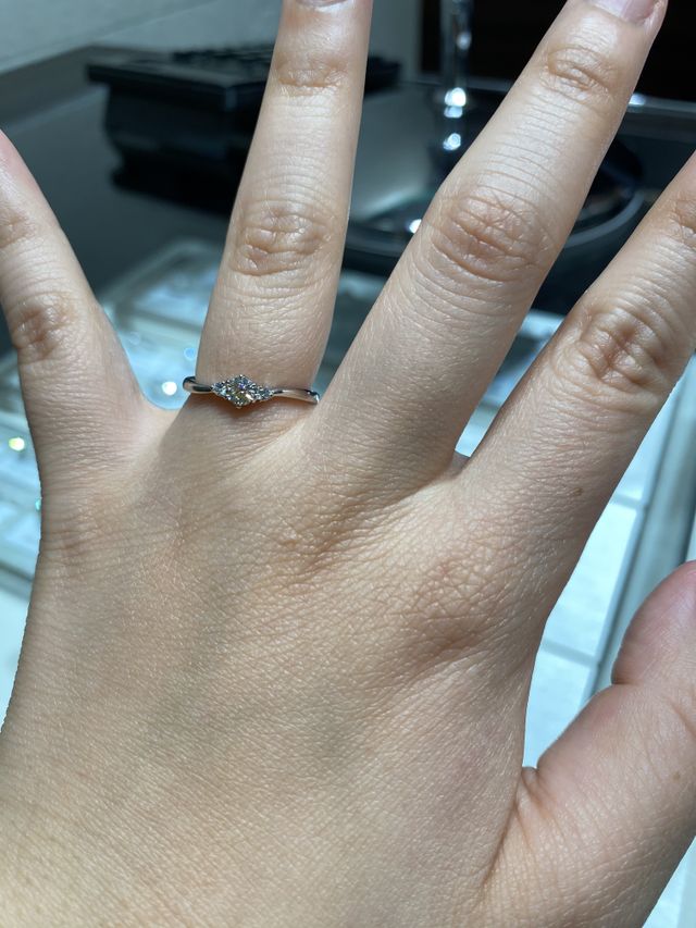 婚約指輪を探し始めて1店舗めということもあり、知識や種類も全く分からないなか、いろいろな指輪の種類を出していただいて、試着しました。指が太くて短いのですが、私の指に合うような指輪を提案してくださいました。