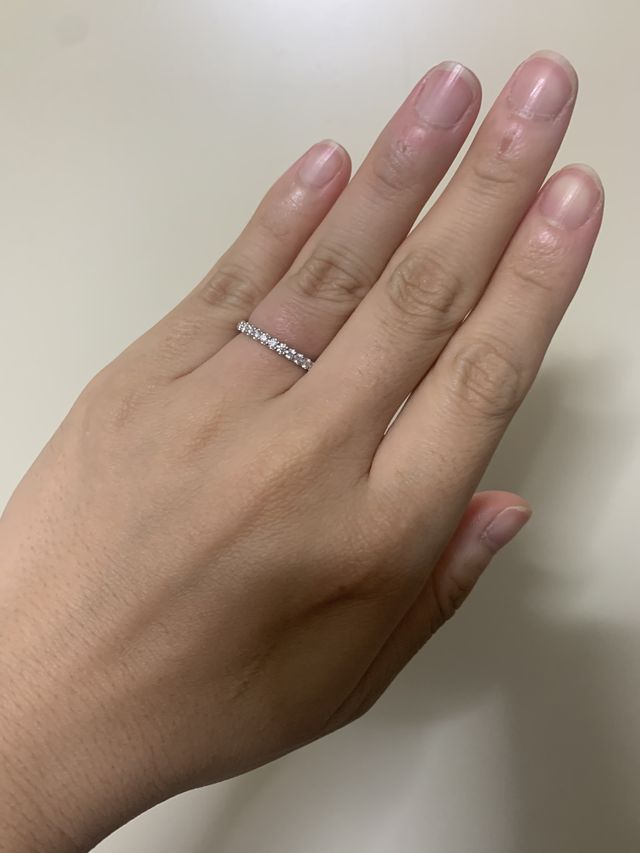 元々、ハーフエタニティリングが欲しくてこちらを試したらとっても良かった上に、婚約指輪と結婚指輪は同じメーカーで重ね付けした際に高さや全体のバランスが綺麗にまとまるのが良かったのもあり、こちらにしました。ちたみに結婚指輪はorigin3石タイプの2.5mm幅のにしました。