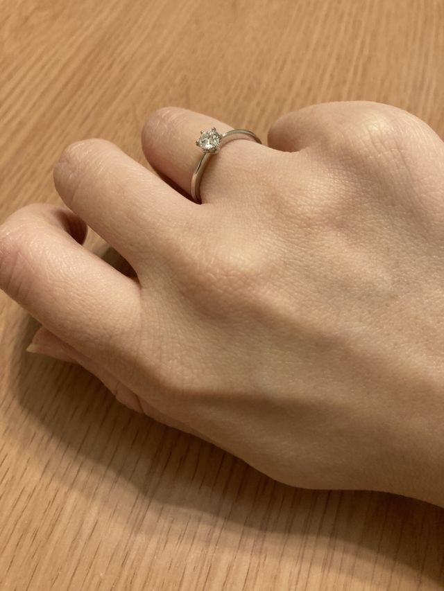 彼がプロポーズ前にひとりで選んでくれた指輪なのですが、ダイヤモンドの質、輝きが最後の決め手になったようです。台座は自分で決めました。細身で控えめなウェーブのデザインが、指を女性らしく華奢に見せてくれるところが気に入りました。
