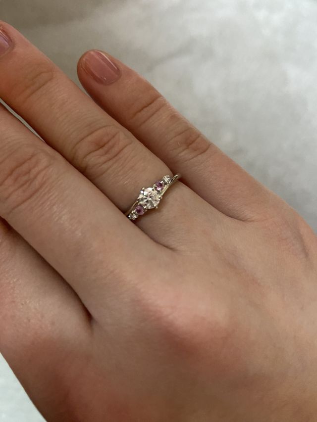 ピンクが好きなので、それが叶うものを探していました。最初は別ブランドの指輪を見ていましたが、ピンクダイヤということもあり、金額面で気になっていました。こちらのリングはピンクサファイアということで、比較的値段もお安く、デザインも気に入ったため、こちらのリングに決めました。