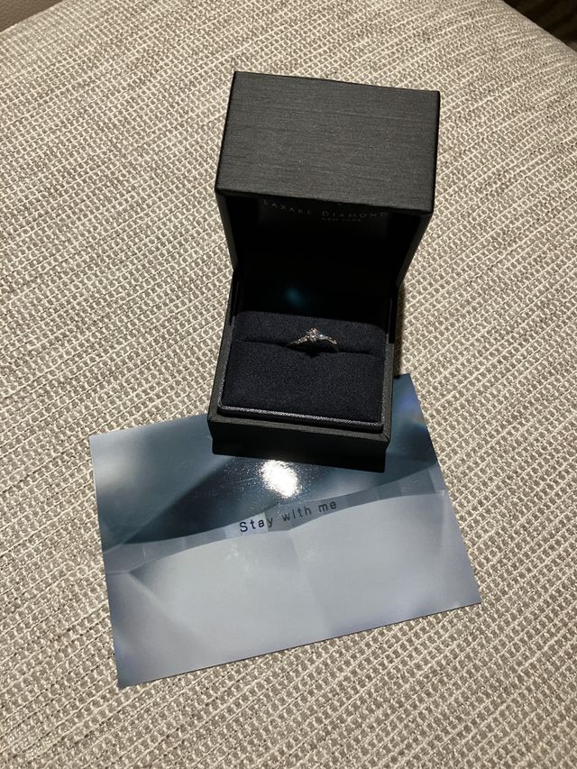 ダイヤモンドが暗い場所でもキラキラ輝いていてとても綺麗でした。ダイヤモンドはそんなに大きくありませんが、キラキラ輝いているのでとても存在感があり、実際よりも大きいサイズに見えます。親や友人にも言われます。