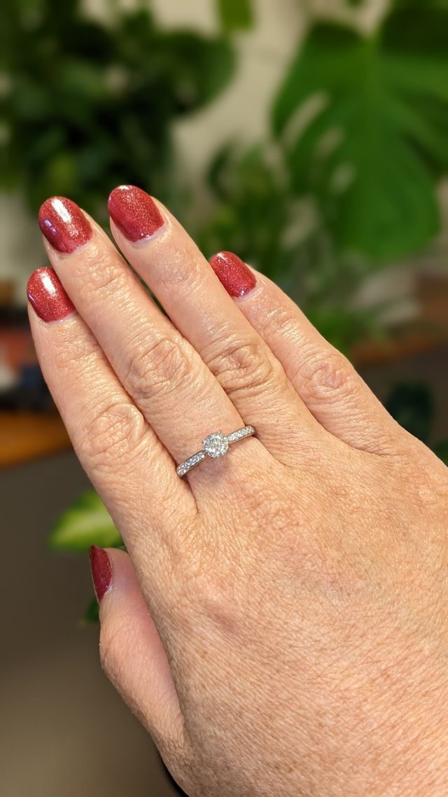 年齢を重ねてシンプルな一粒ダイヤの指輪より周りにダイヤモンドが散りばめられているタイプの方がしっくりきたから。