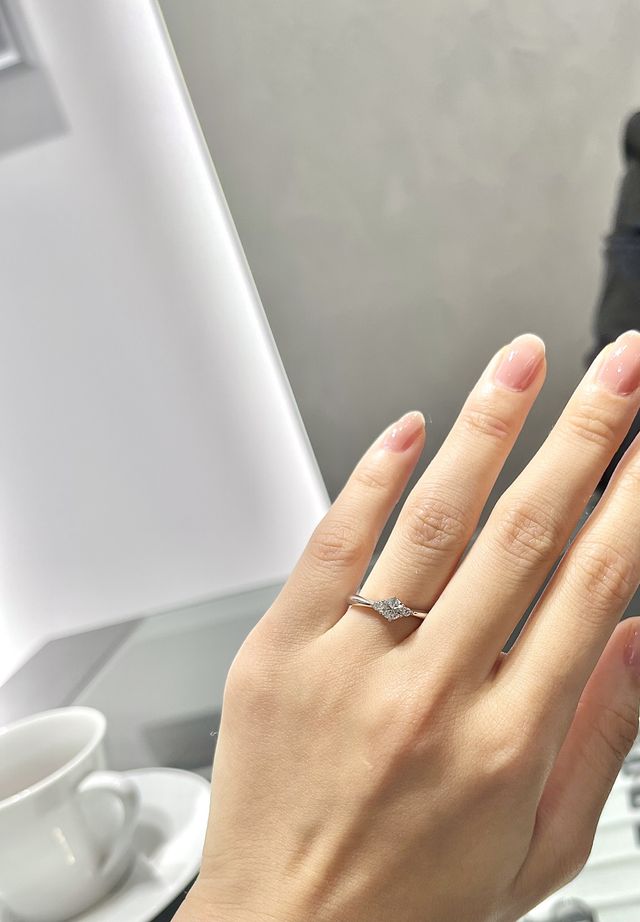 結婚指輪と重ね付けした時に馴染み、かつ婚約指輪単体でつけた時にも手元が寂しくならないデザインで探しました。両脇にメレダイヤがあることで華やかに見えますが、可愛らしすぎることもなく、とても好きなバランスでした。また、爪が低めなので普段使いしやすいところも決定のポイントです。