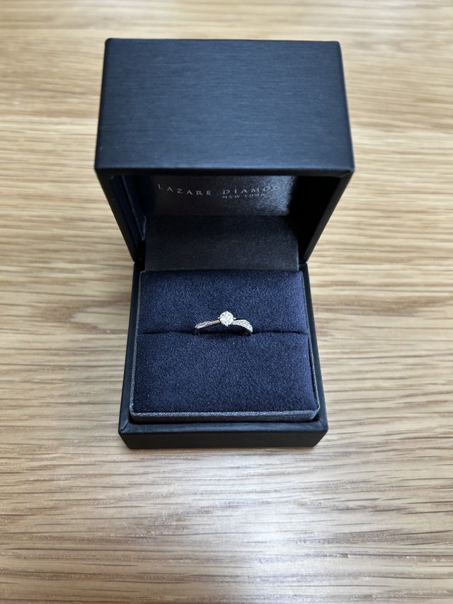 どの角度から見てもダイヤモンドの七色の輝きが綺麗にみえるところが魅力です。定番のダイヤ一つやダイヤの周りに複数ダイヤモンドかあるデザインとも迷いましたが、こちらのデザインは婚約指輪として長く使えるデザインだと思ったので購入しました。