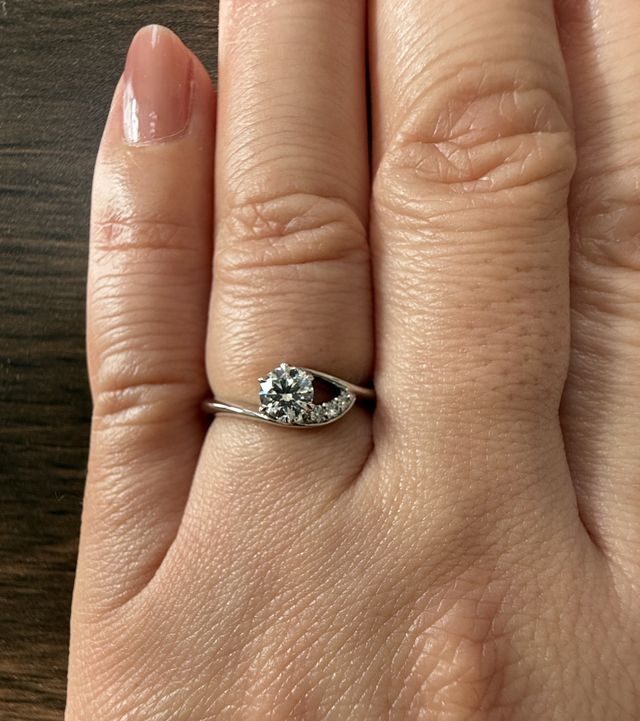 プロポーズは夜の明かりが少ない中でしてもらったのですが、ライトに当たっているわけではないのに虹色に輝くダイヤにとても驚きました。本当によく輝くので実際のカラットサイズよりも石が大きく見えます。