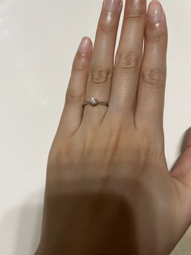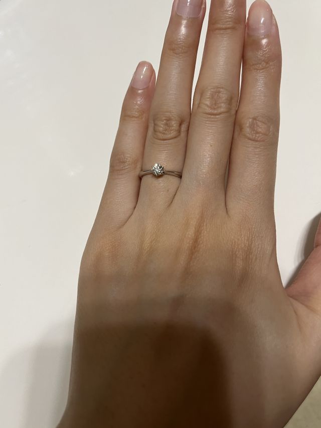 この指輪は、どの角度から見てもキラキラと美しく輝くんです!着けるたびに手元がパッと華やかになります。実は他にもいくつか試着したのですが、この指輪はカットと仕上げが本当に丁寧で、私の指がすらっと細く、長く見えることに感動しました。シンプルなデザインなので、普段使いはもちろん、友人の結婚式に着けて行っても褒められて嬉しかったです。毎日身に着けたいと思っていたので、変色や傷に強い高品質な素材なのも嬉しいポイントでした。私にとっては、プロポーズされた日の感動や、彼との思い出が詰まった、かけがえのない宝物になりました!