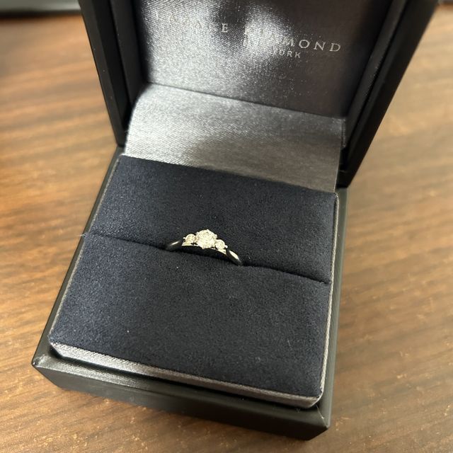 華やかかつ指が細く見えるようなデザインがお気に入りです!特に中央にいくに連れて細くなるデザインと3粒ダイヤの輝きに惹かれました。他にもシンプルな一粒ダイヤ等も見させていただきましたが、重ね付けも意識して決めました!