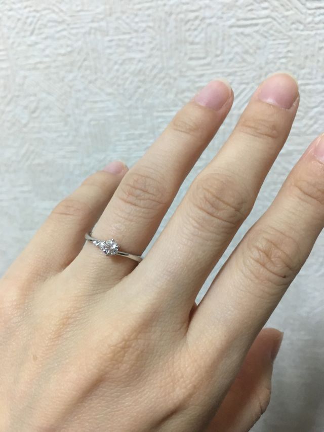 いろんなデザインの指輪をはめてみましたが、ウェーブタイプ、ダイヤ三連の華奢なリングを選びました。