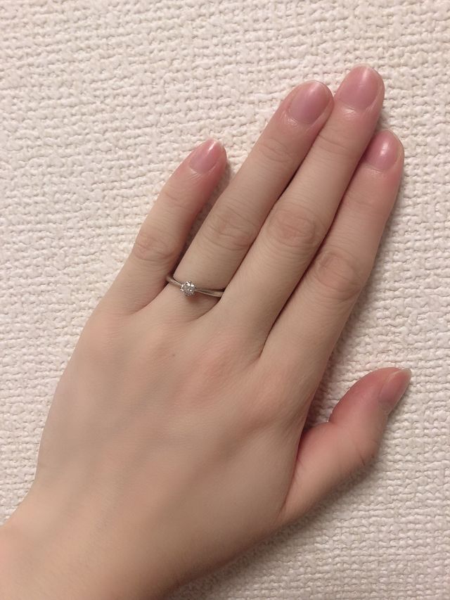 値段も考慮してこのブランドになり、その中でもいくつか種類がありましたが、こちらの商品はダイヤモンドが指から離れた、すこし盛り上がっているデザインであるため、1番ダイヤモンドが輝いて見えました。