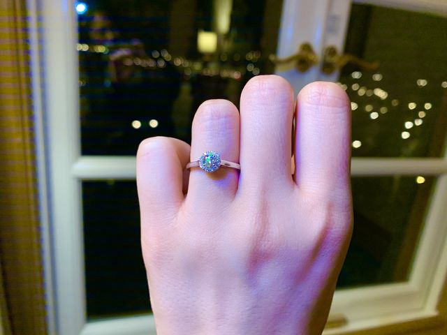 シンプルだけどキラキラしているのが欲しくてこれにしました。ダイヤモンドの輝きが凄くて一粒の周りにダイヤモンドも敷き詰められていて、太陽の下とか蛍光灯の下なら普段でも存在感がすごいのに、本当にキラキラして眩しいくらいです。キラキラを求めているならオススメです。