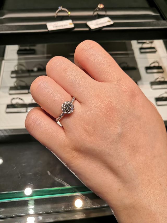 ヘイロータイプを探して試着しました。アームにラインメレがあるタイプが、きらきらしてとてもかわいかったです。ヘイロータイプは真ん中のダイヤが大きく見えます。アームのダイヤの周りのプラチナの囲みが目立つところは好みではありませんでした。