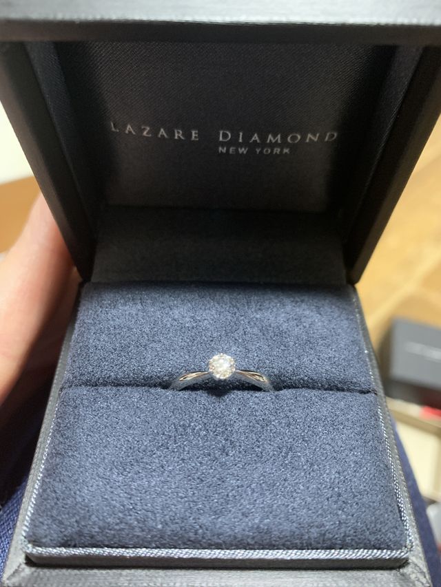 来店当初は、一番お手頃な婚約指輪を購入したいという考えでしたが、さまざまな種類の素敵な指輪を並べて試着させて頂くと迷いがでました。私は、手が比較的大きいため、太めのリングが気に入りダイヤモンドは、最終的に大きさが決め手となりました。