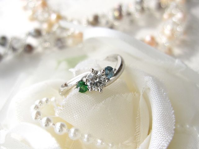 お互いの誕生石で真ん中のダイヤを挟んだシンプルなデザインが決めてでした。