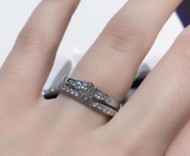 花麗(はなうらら)という名前の通り、真ん中のダイヤの周囲から花びらのように流れる左右非対称のデザインでした。両脇のダイヤを埋め込みタイプだとかなり華やかになりました。両脇ダイヤなしタイプでも華やかなデザインではあります。