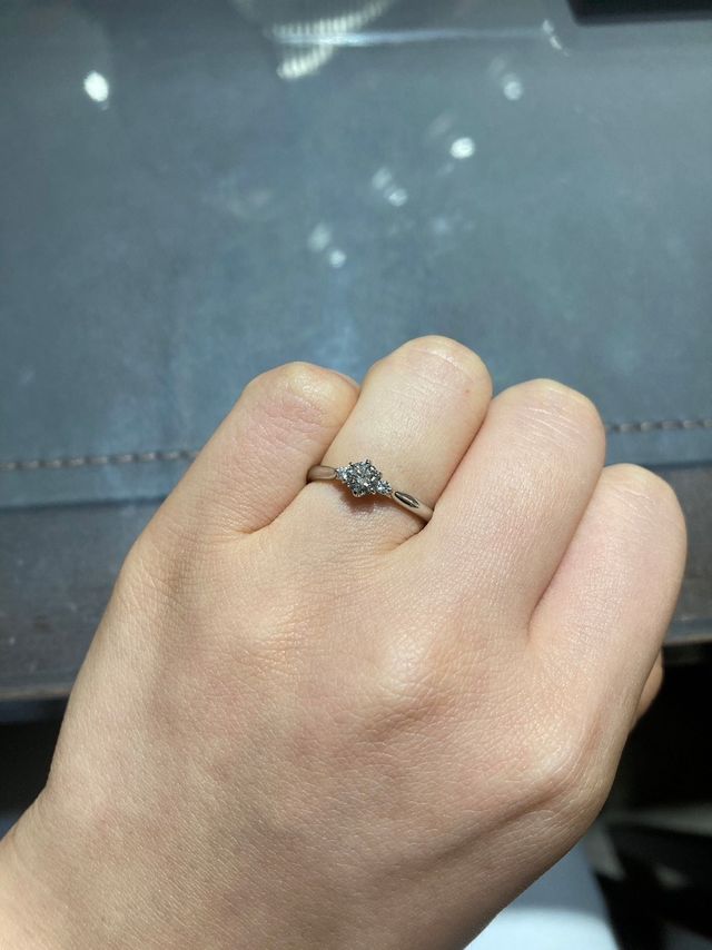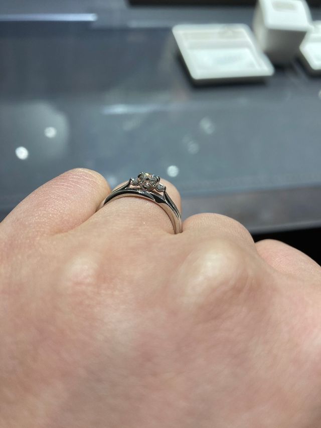 HPで見たときから、真正面からのデザインも横から見たデザインも可愛くて、一目惚れしていました。実際に店頭で見ると、ダイヤモンドの光り方がとても綺麗で、細身で、着け心地もとても良かったので、この婚約指輪に決めました。
