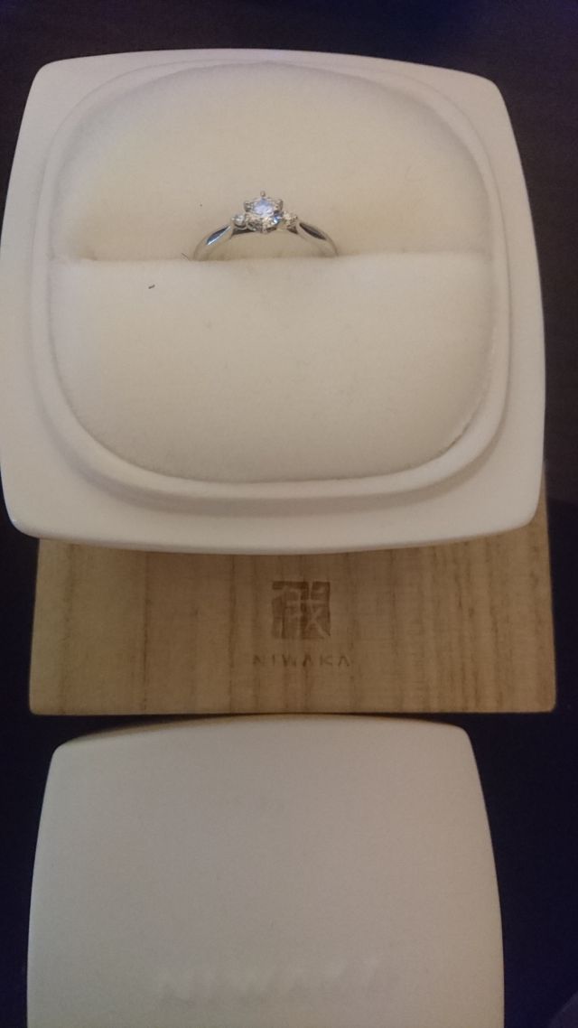 デザインが非常に可愛く、着けたときに指が細く見えたこと。やはり見た目の可愛さと自分に実際に合わせた時だと見栄えが全然変わる。この指輪は宝石自体が大きくなくても、オシャレにみえる婚約指輪であったことが決め手。