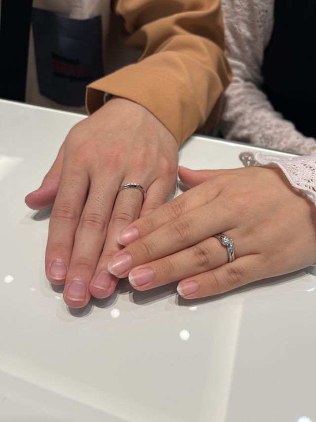 桜をモチーフにしており、重ね付けした時がとんでもなく可愛く、彼がこの指輪に一目惚れしました。婚約指輪は桜イメージで、ダイヤを五つのツメ(?)で支えているところが他の指輪と違い、印象に残るとともに、デザインに込められた想いに大和魂を感じました。