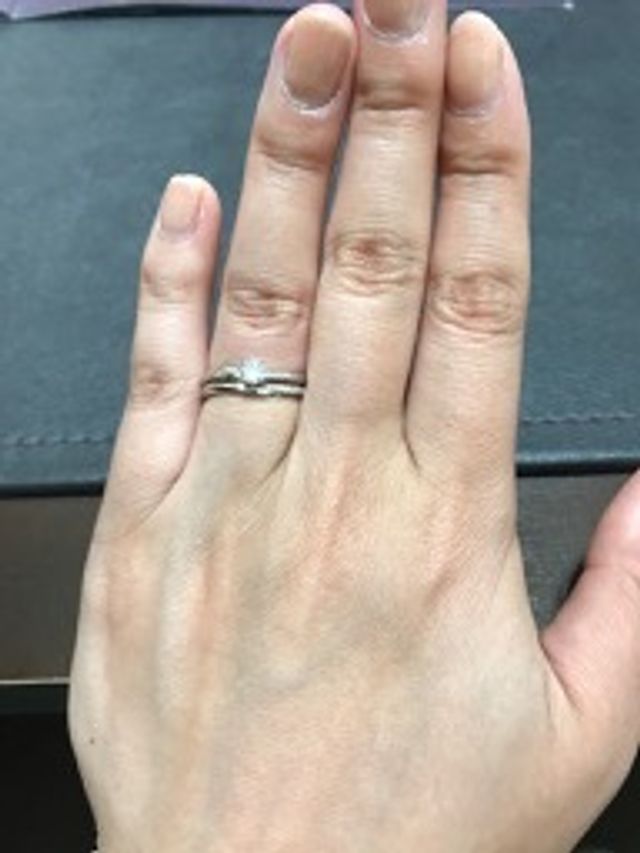 セットリングということもあり、つけたときの2つのリングの重なり方やデザイン性はとてもよかったです。流れるようなデザインで、名前の通りだなと思いました。セットリングはエンゲージとマリッジを普段から重ね付けしたい人向けですね。