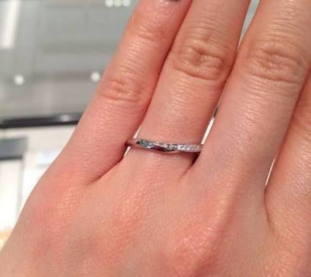 結婚指輪が派手すぎず、シンプル過ぎないところが気に入りました。あと、少しねじれたデザインなので、付けた時に指が細く見えます。 また、結婚指輪と婚約指輪を一緒に付けたときのバランスが非常にキレイです。