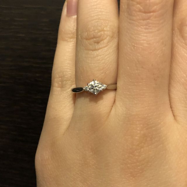 婚約指輪は、真ん中に大きいダイヤモンド、両脇に少し小さいダイヤモンドが並ぶデザインのもので探していて、デザインがとても気に入ったことと、リングの部分もとてもしっかりしていたためこちらの指輪に決めました。