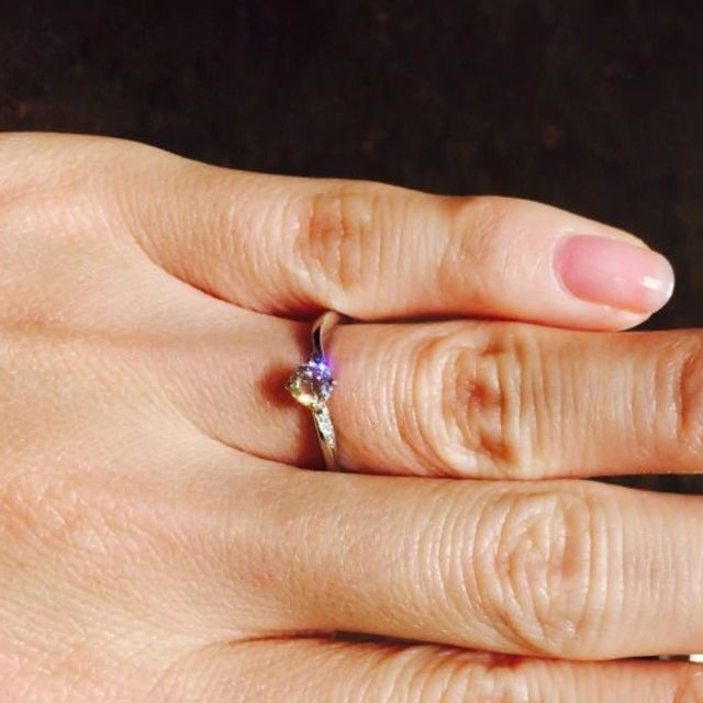 一粒ダイヤのリングだとシンプルすぎると感じ、最初はサイドに一石ずつ付いたリングを探していましたが、実際に試着したところこちらのメレダイヤが連なるタイプの方がより華麗だと思いました。メレダイヤの連なりが水の流れの様になっている所も素敵です。