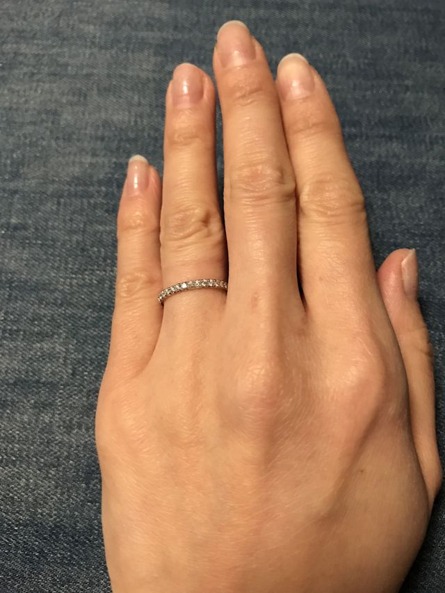 細めなので結婚指輪とも重ね付けができると思いました。婚約指輪・結婚指輪・両方と3パターンの付け方ができるので、飽きなく長く使えること、ファッションに合わせて付け替えれること。