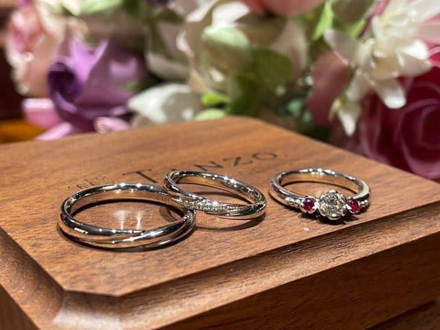 婚約指輪は芍薬をイメージしており、真ん中のダイヤは白い芍薬(花言葉は幸せな結婚)、両脇を赤い芍薬(花言葉は誠実)という願いを込めました。
