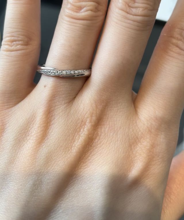 ウェーブがかかった少し個性的なデザインです。婚約指輪と重ね付けしても隙間がぴったり埋まるので、より華やかな印象になると思います。ダイヤの質はとても良い