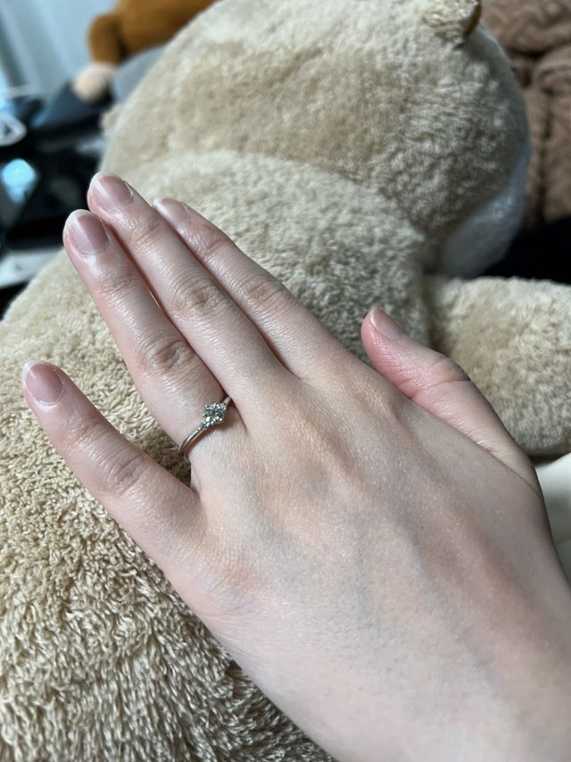指が細い方なので、デザインが華奢なものを選びました。一生物で長く持つものなのでシンプルで歳をとっても長く使えるのも決め手です。お店では気になるものすべて試着させてもらえました。またサイズ変更が何回でも無料なのがとても嬉しいです。