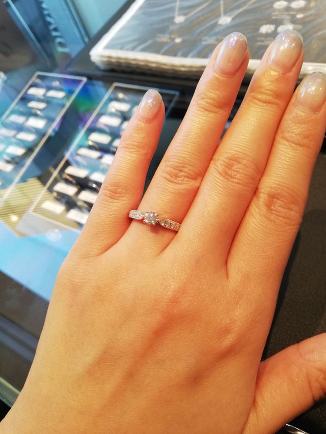 買う決めてになったのは彼が、ベルギー人でしたためエクセルコダイヤモンドにいって婚約指輪も結婚指輪も見てみたいという気持ちがありました。そこでちょうどデザインや、クオリティーのいいダイヤモンドをみて決めました