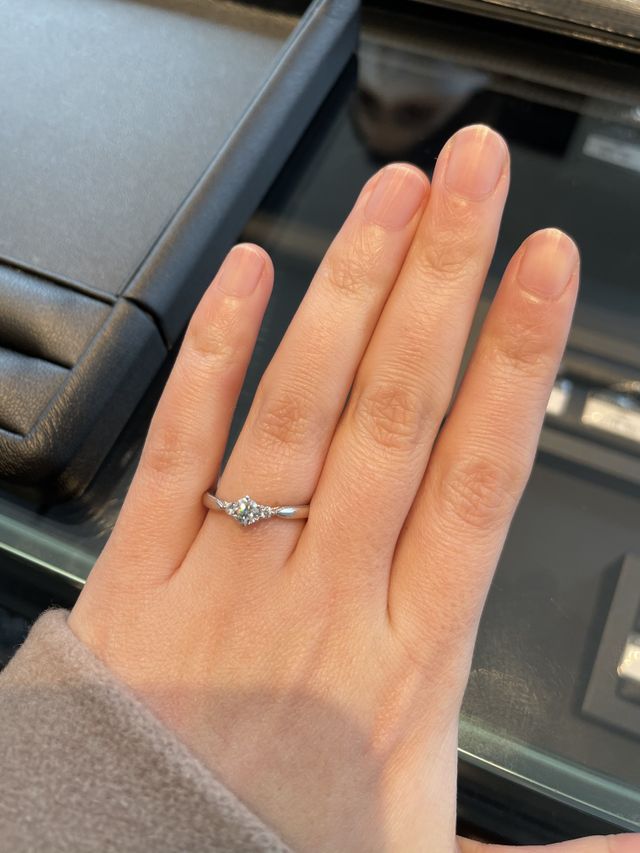 真ん中に大きめのダイヤモンド、サイドにも小さなダイヤがあしらわれているデザインです。リングの縁にもデザインがあり、とてもおしゃれでかわいかったです。シンプルですがサイドにもダイヤがあるので少し華やかさもあり、シンプルな結婚指輪とのセットでもとても似合いました。