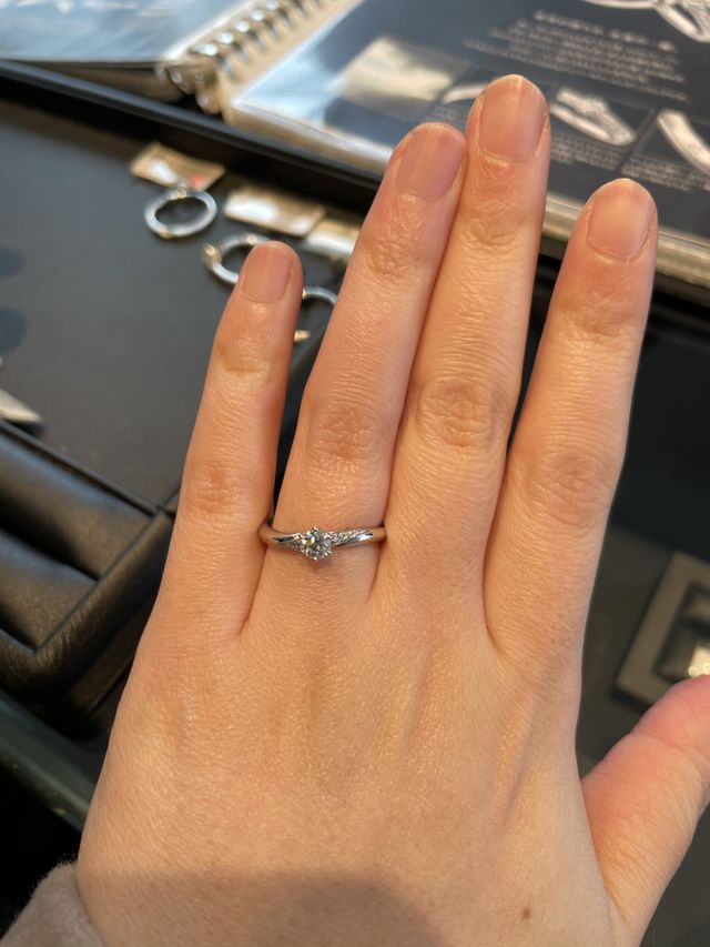 とにかくデザインがとてもかわいいです。リングは少し太めで存在感があります。リングが少しウエーブしているので角度を変えて見るとまた違う見え方で素敵でした。