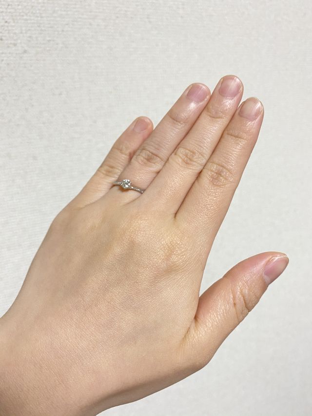あまり派手すぎるデザインは好みではなかったので、シンプル寄りのデザインをいくつか見せてもらいました。その中で、リング自体はストレートですが左右少しひねりを入れて石が入っているこの指輪にとても惹かれました!ストレートなので結婚指輪は別で購入しましたが重ね付けを考えてもデザインを選びやすく、良かったです。
