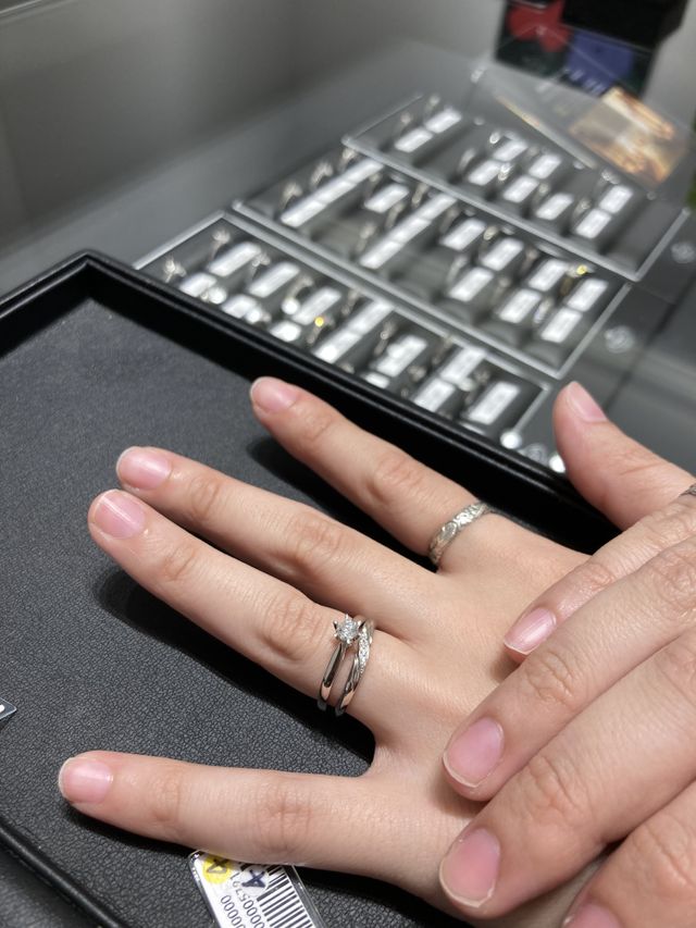 ダイアモンドのみ先に購入してデザインは妻の好きなものにしたかったのでこのような形にした。デザインは結婚指輪と婚約指輪を重ねてつけたいという妻の思いと好みのデザインだったので今回こちらのリングを購入しました