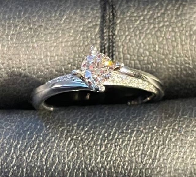 シンプルなデザインなのに、スタイリッシュで洗練されていて、とてもステキでした。一粒の真ん中のダイヤモンドを引き立てる左右についた小さなメレのデザインも素敵で、彼もこれはとてもいいと気に入ってくれて、双方合意でこちらに決定しました。