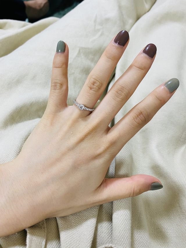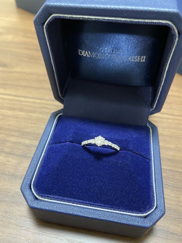 メレありのキラキラ輝くデザインで、普段使いできるような爪が飛び出てない物で、私の小さい手に馴染むようなフレームの細い理想の指輪でした♡