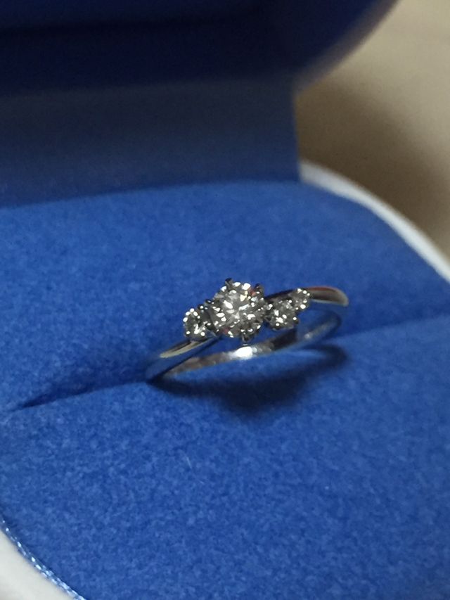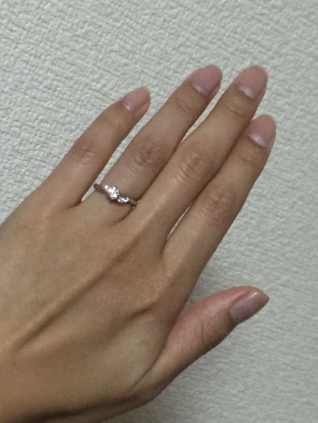 真ん中のダイヤと左右の小さなダイヤのバランスが気に入りました。直線でなく左側はリングの上、右側は下についているのがかわいいです。